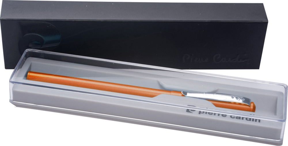 Шариковая ручка Pierre Cardin Actuel. • Корпус - алюминиевый. Клип - сталь. Цвет - оранжевый; • Отделка - глянцевое цветное покрытие; • Детали дизайна - пластик с хромированным покрытием; • Упаковка - пластиковая коробочка с пластиковым ложементом с муфтой черного цвета; • Размер упаковки - 158 х 37 х 19 мм, вес 28 гр Комплектация: • Металлический шариковый стержень с логотипом Pierre Cardin на корпусе, с чернилами синего цвета; • Инструкция по использованию ручки. Серия ручек Pierre Cardin ACTUEL – это легкие и удобные шариковые ручки с современным дизайном и широким ассортиментом отделок. Разнообразие форм, цветов, механизмов отражают динамичный ритм жизни, новые возможности и перспективы. Успех во всех начинаниях гарантирован! Главное, не останавливаться!