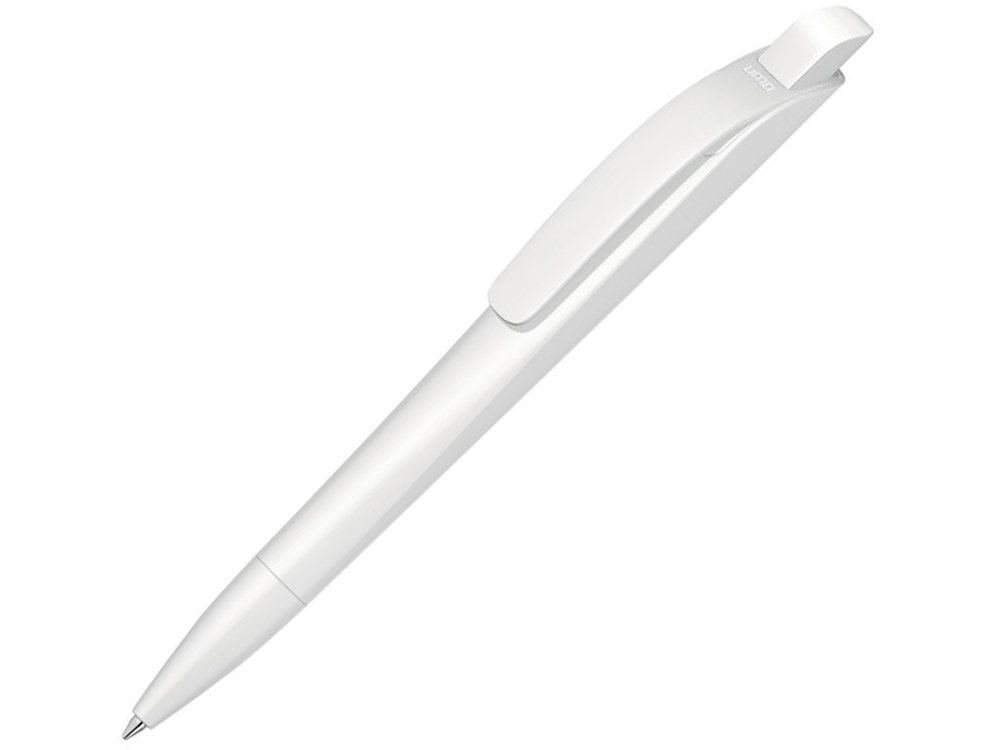 Автоматическая шариковая ручка с нажимным механизмом, матовым тонированным белым корпусом и цветным наконечником, широким изогнутым клипом.