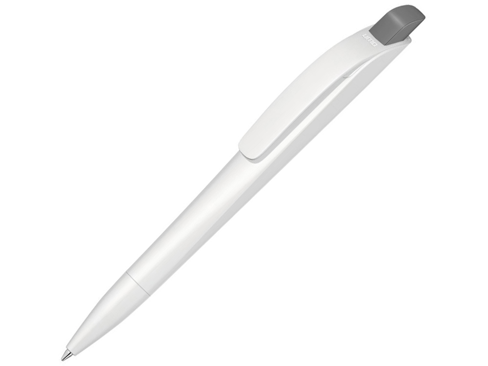 Автоматическая шариковая ручка с нажимным механизмом, матовым тонированным белым корпусом и цветным наконечником, широким изогнутым клипом.