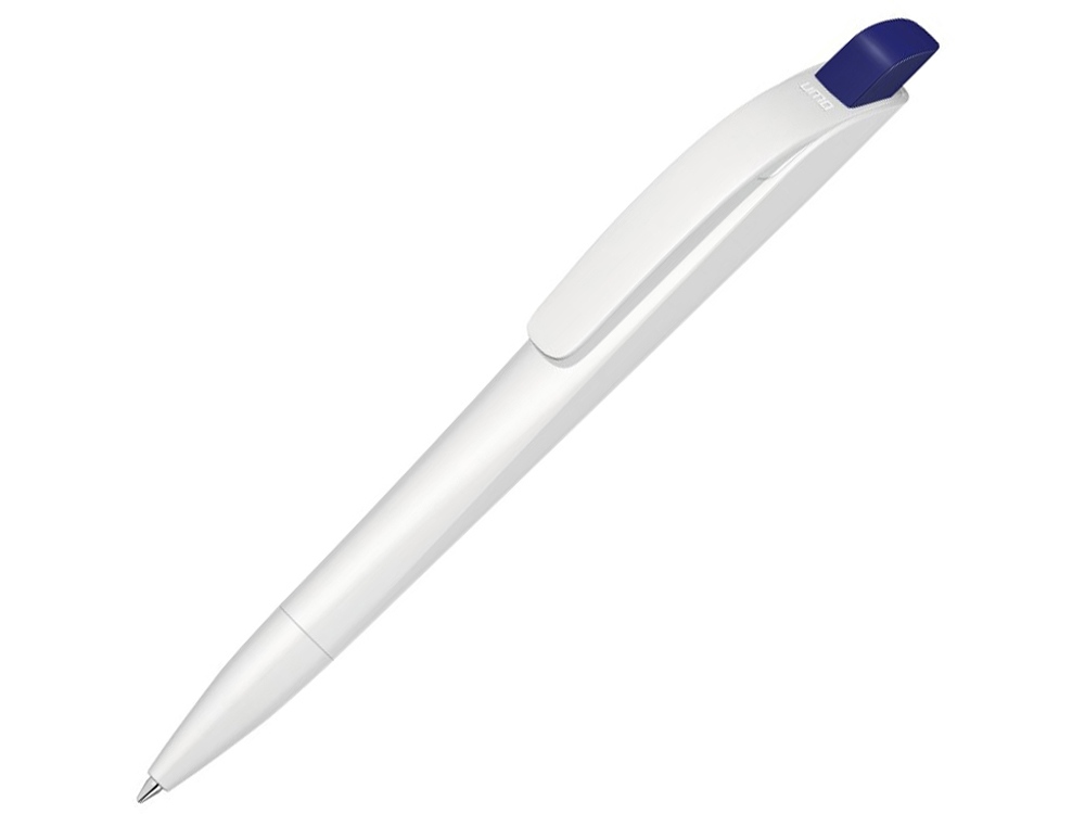 Автоматическая шариковая ручка с нажимным механизмом, матовым тонированным белым корпусом и цветным наконечником, широким изогнутым клипом.