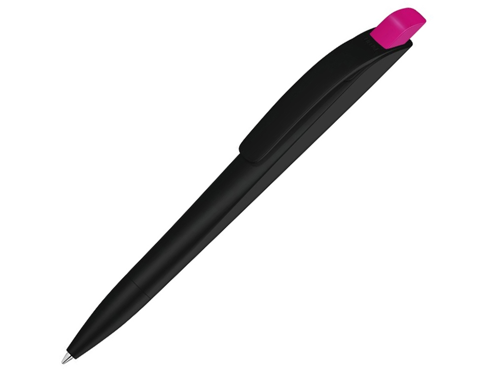 Автоматическая шариковая ручка с нажимным механизмом, матовым тонированным черным корпусом и цветным наконечником, широким изогнутым клипом.