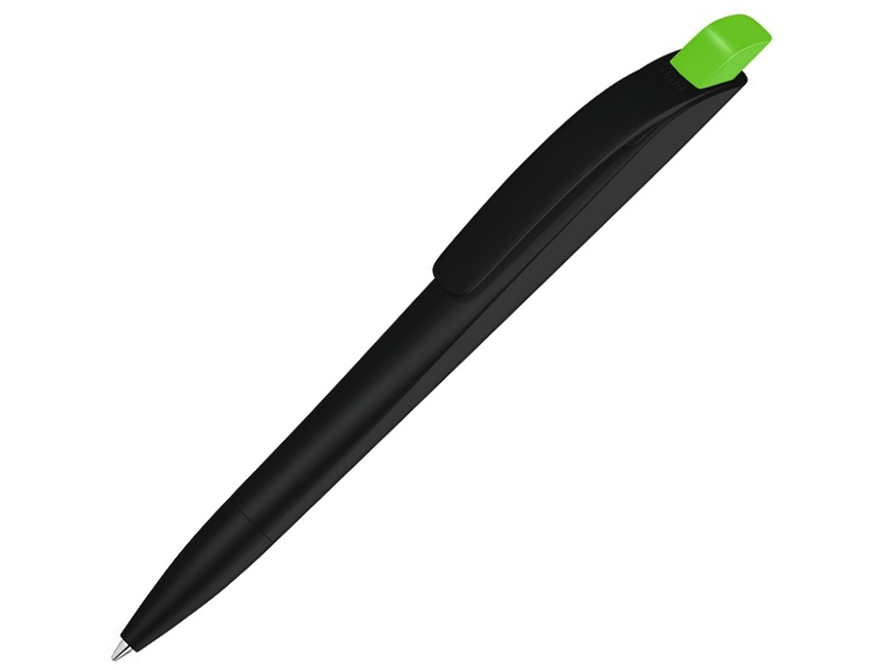 Автоматическая шариковая ручка с нажимным механизмом, матовым тонированным черным корпусом и цветным наконечником, широким изогнутым клипом.