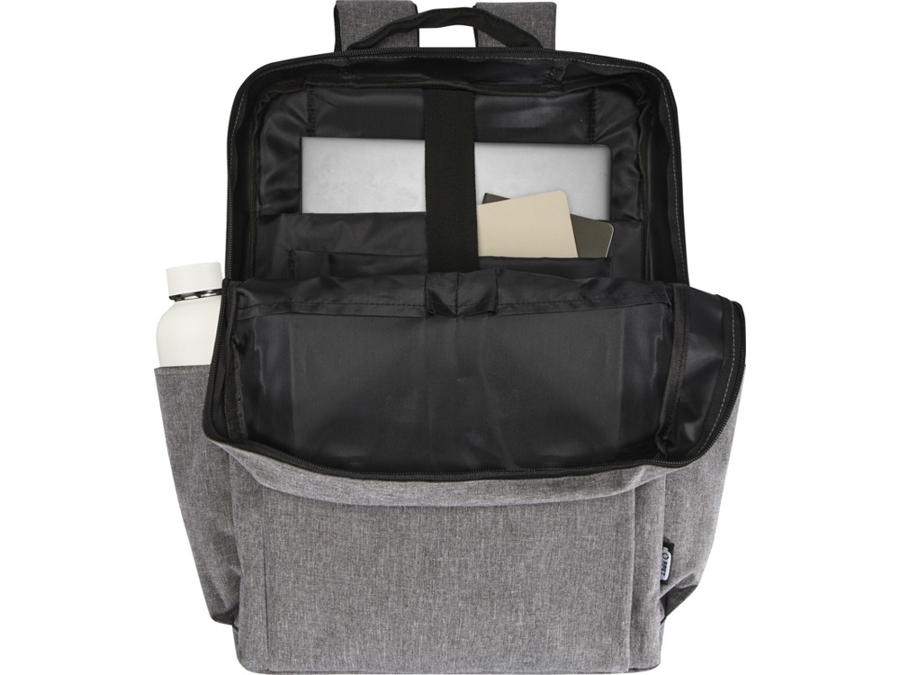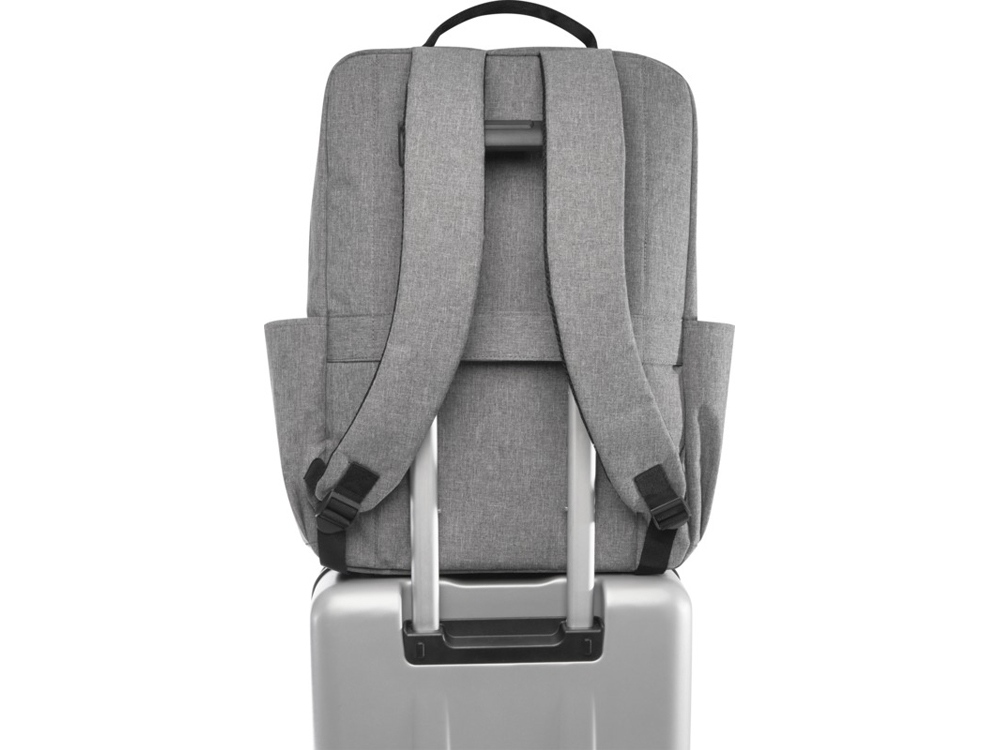 Рюкзак Libra изготовлен из переработанного полиэстера, сертифицированного согласно GRS, и подкладки из RPET. Он оснащен отделением для ноутбука диагональю 15 дюймов с дополнительным мягким карманом для планшета и карманами-органайзерами внутри. Снаружи также имеется несколько карманов, мягкие регулируемые плечевые ремни и ремень для крепления для ручки чемодана сзади. Выдерживает вес до 10 кг. GRS certified recycled polyester.