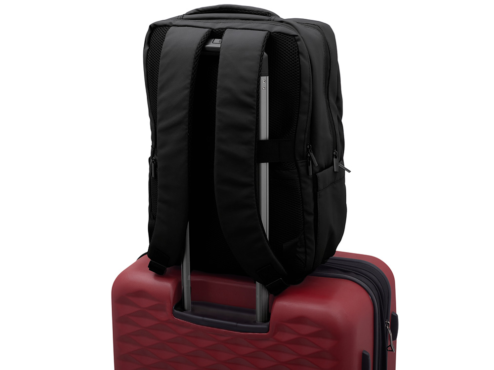 Непромокаемый бизнес рюкзак с двумя вместительными отделениями и карманом на молнии спереди. В одном отделении расположены карман для ноутбука и планшета, в другом органайзер и много пространства для одежды и других вещей на случай деловой поездки. На сетчатой спинке расположен потайной кармана на молнии для документов и личных вещей и ремень для крепления на ручку чемодана. Сверху удобная мягкая ручка для переноски. Лямки регулируются по длине.