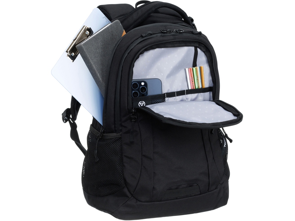Городской рюкзак TORBER Rockit T2376 - это отличное решение для тех, кто живёт активной жизнью, предпочитает чёрный цвет и минимализм, но при этом чтобы всё необходимое было легко доступно и упорядоченно. Карман-органайзер и кольцо для ключей позволят вам упорядоченно хранить большое количество мелких вещей, необходимых в дороге. Спинка рюкзака с системой циркуляции воздуха имеет специальную рельефную поверхность, обеспечивающую удобное прилегание к спине Благодаря прочной эргономичной ручке вы можете носить рюкзак не только на спине, но и в руках. Два эластичных боковых кармана позволят вам носить зонт или бутылки с водой. Регулируемые плечевые ремни позволяют вам выбрать максимально удобно положение рюкзака на спине. Благодаря объёму 24 л у вас есть возможность взять с собой всё необходимое. Функциональная организация: - Мягкое отделение подходит для большинства ноутбуков с диагональю экрана до 15; - Карман-органайзер включает в себя брелок для ключей и различные разделительные карманы для мелких предметов; - Мягкие регулируемые эргономичные плечевые ремни с подкладкой из дышащей сетчатой ткани; - Спинка рюкзака с системой циркуляции воздуха имеет специальную рельефную поверхность, обеспечивающую удобное прилегание к спине и вентиляцию; - Два сетчатых боковых кармана для бутылок с водой или зонта; - Ремень для соединения с ручкой чемодана дает возможность удобно перемещаться с багажом, держа рюкзак и чемодан одной рукой