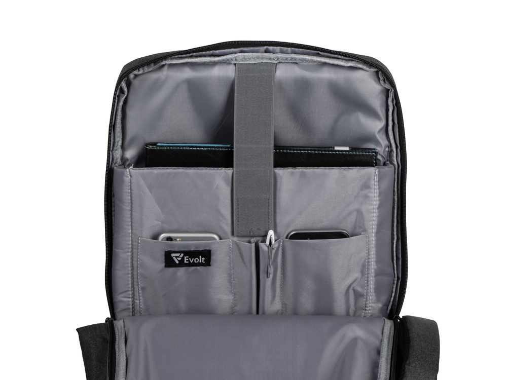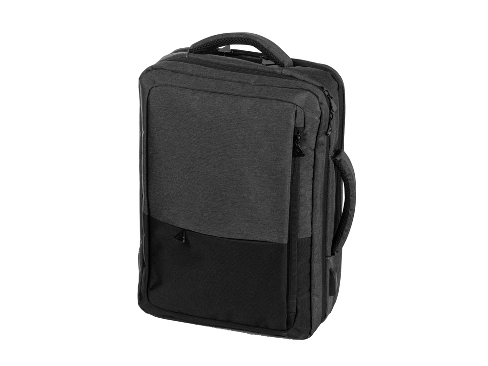 Уникальный и удобный рюкзак-трансформер может легко превратиться в элегантную сумку для деловых поездок благодаря двум вариантам использования. - большое отделение с эластичными фиксирующими ремнями для одежды и карабином для ключей - отделение для ноутбука с органайзером - спереди 2 кармана на молниях - USB выход - на спинке потайной карман на молнии - регулирующиеся по длине лямки - светоотражающий элемент и карман на молнии для карточек и других ценных мелочей на лямке - ремень для крепления на чемодан - дышащая спинка