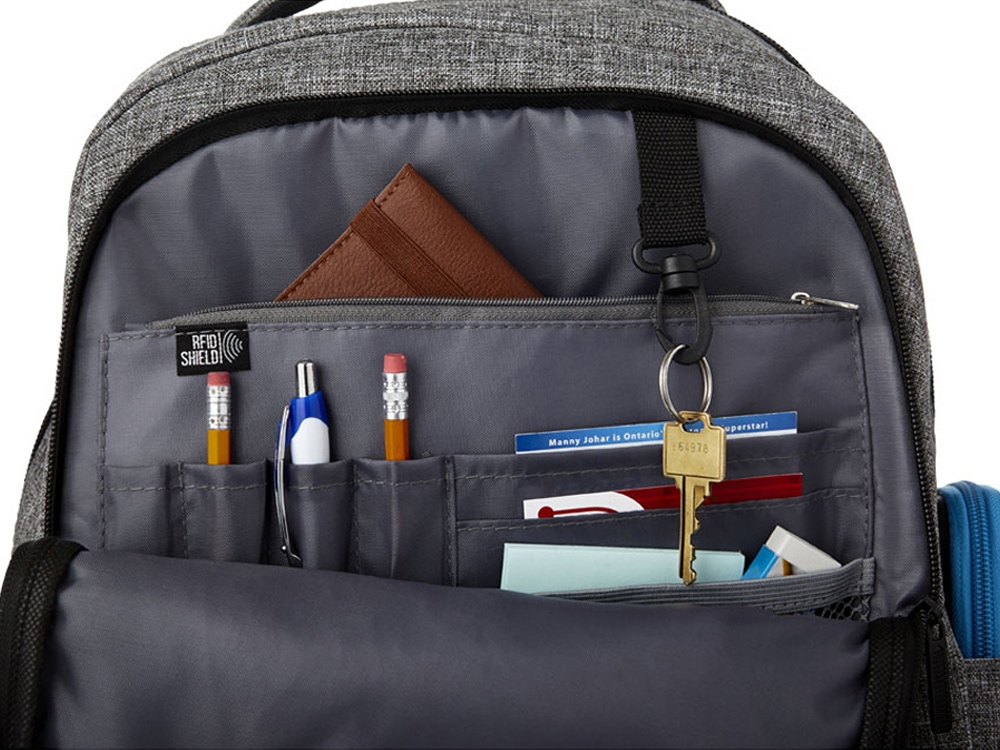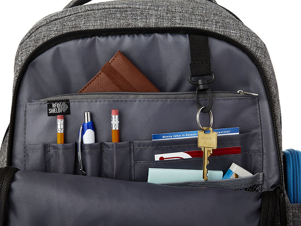 Рюкзак Vault для ноутбука 15.6 с защитой RFID. Изящный, современный рюкзак для ноутбука 15,6 с большим передним карманом на молнии с карабином для ключей, и скрытым карманом с защитой RFID, чтобы защитить ваши карточки и паспорт от кражи личных данных. Большое основное отделение вмещает ноутбук 15,6 и специальный карман для IPad или планшета. Плотная спинка. Передняя вертикальная молния разработана, чтобы дать вам быстрый доступ к переднему карману. 2 дополнительных боковых кармана для большего места, регулируемые, мягкие ремни рюкзака позволят прикрепить к ним дополнительные аксессуары. Ручка вверху и стропа для крепления к чемодану. 600D полиэстер с акцентами из ПУ винила.