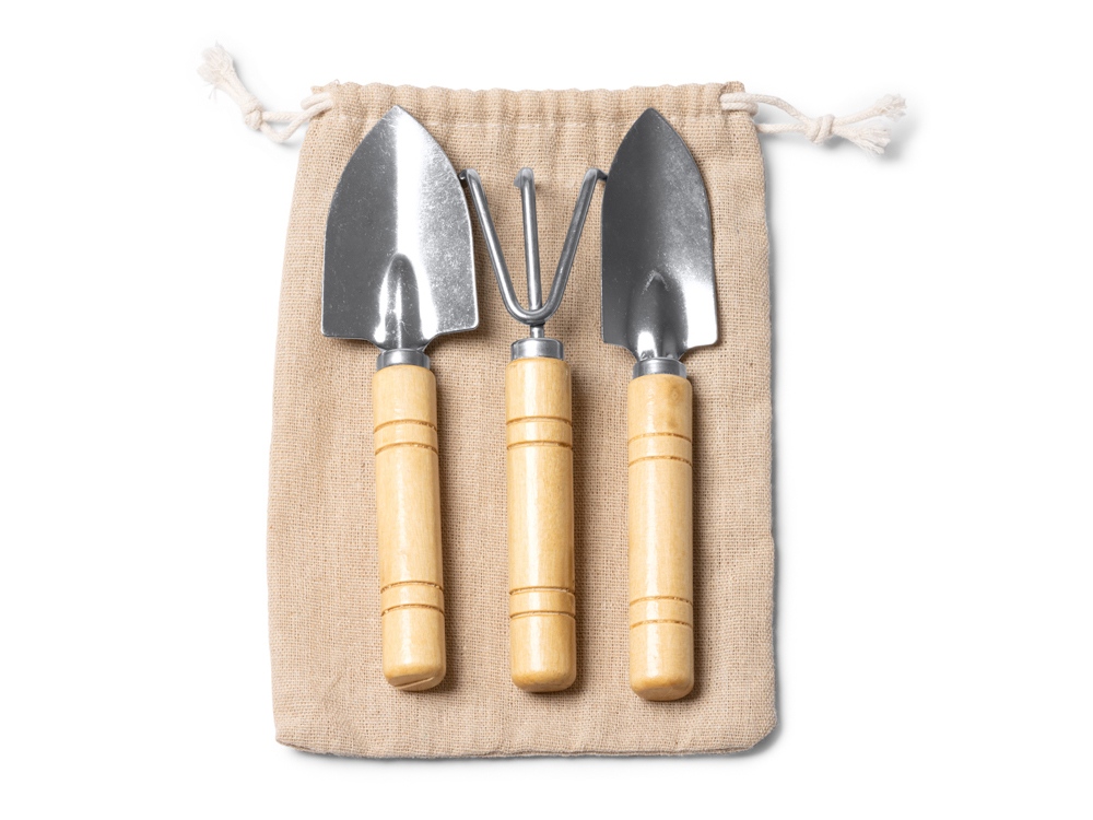 Садовый набор из 3 аксессуаров из нержавеющей стали с бамбуковыми ручками. Включает большую и малую лопатки и грабли. В комплект входит хлопковый мешочек.
