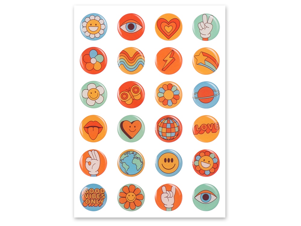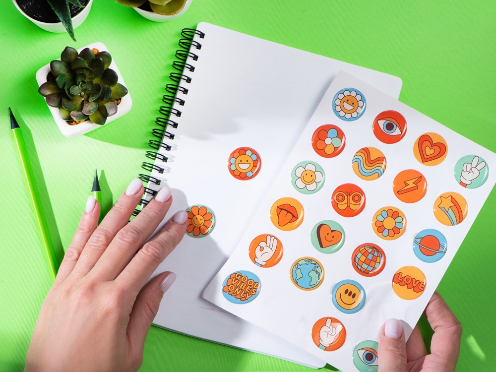 Стикеры из полимерной смолы очень яркие, чёткие и очень привлекательные. Изображение находится внутри выпуклой линзочки и выглядит объёмным. Такой эффект достигается за счёт заливки эпоксидной, или по-другому — полимерной, смолой — она наносится на изображение в жидком виде, а потом застывает, создавая объём и не давая картинке выгорать и повреждаться. Стикеры могут быть круглой, квадратной или прямоугольной формы. Для квадратных и прямоугольных стикеров немного закругляют углы, это необходимо для того, чтобы смола не вытекала при изготовлении.