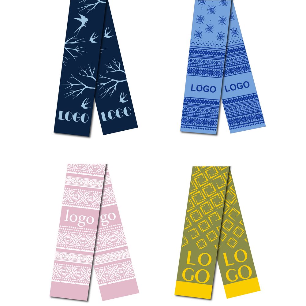 Шарф с вывязанным логотипом и индивидуальным рисунком в фирменной цветовой гамме.
