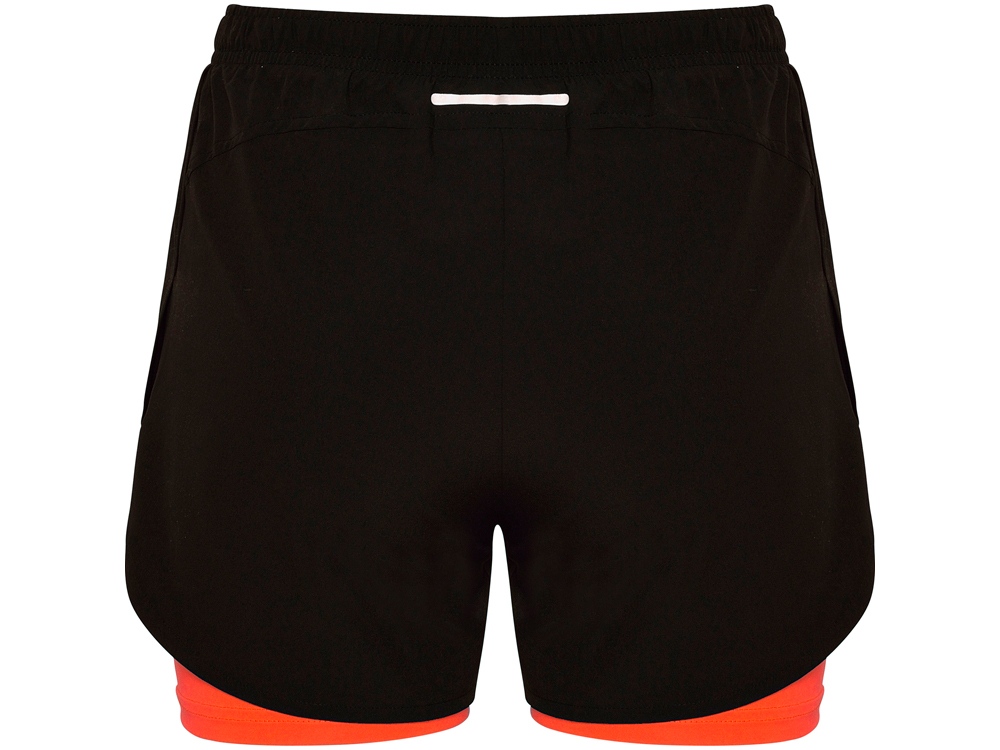 Женские спортивные шорты с контрастными внутренними короткими легинсами. Эластичный пояс с внутренним шнурком для регулировки. Светоотражающие детали. Специальная эластичная ткань для бега.