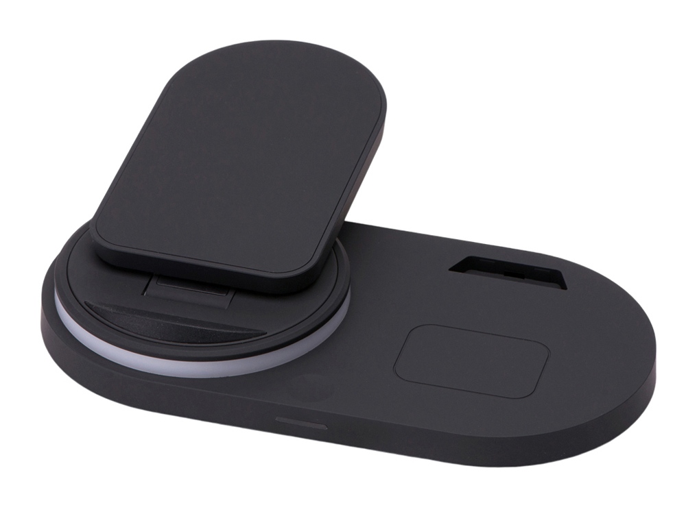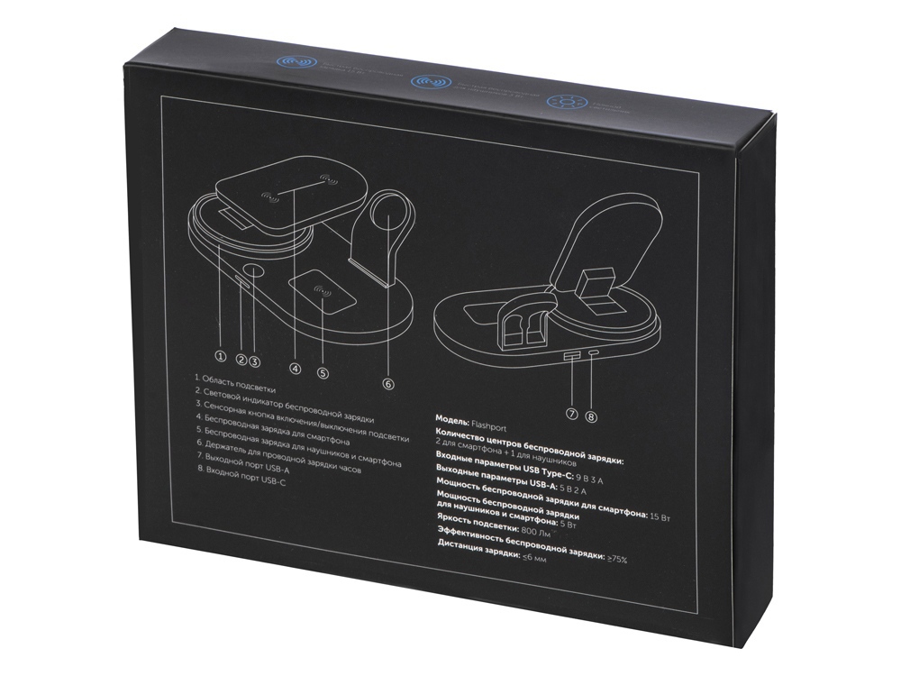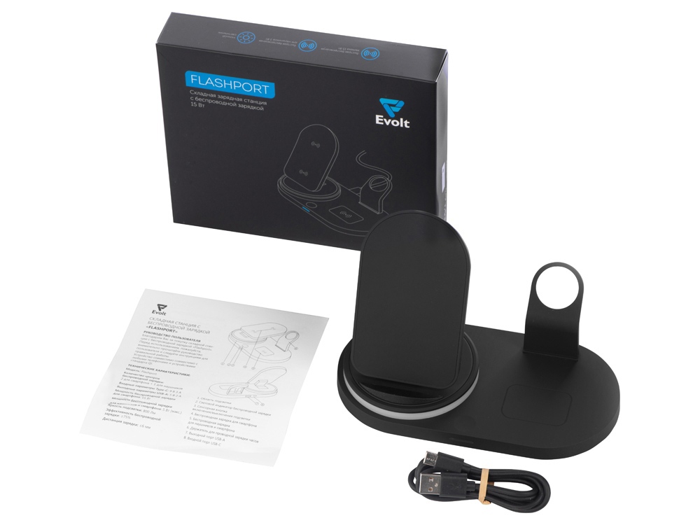 Flashport от Evolt - это складная зарядная станция с беспроводной зарядкой для телефона и наушников. В комплекте также идет подставка под зарядку для наручных смарт-часов. На регулируемой панели зарядки смартфона расположены 2 катушки (2 центра беспроводной зарядки), которые позволяют заряжать ваш девайс как в вертикальном, так и горизонтальном положении. Беспроводная зарядка для наушников мощностью 5 Вт подходит для зарядки не только беспроводных наушников, но и второго смартфона. Чтобы включить встроенную лампу, нажмите сенсорную кнопку 1 раз. Для плавного изменения яркости света нажмите и удерживайте сенсорную кнопку при включенной лампе. Кабель 100 см в комплекте. • Быстрая беспроводная зарядка смартфона 15 Вт • Беспроводная зарядка наушников 5 Вт • Лампа-диммер яркостью до 800 Лм • Дополнительный порт USB-A для зарядки внешних устройств • Мягкое прорезиненное покрытие корпуса