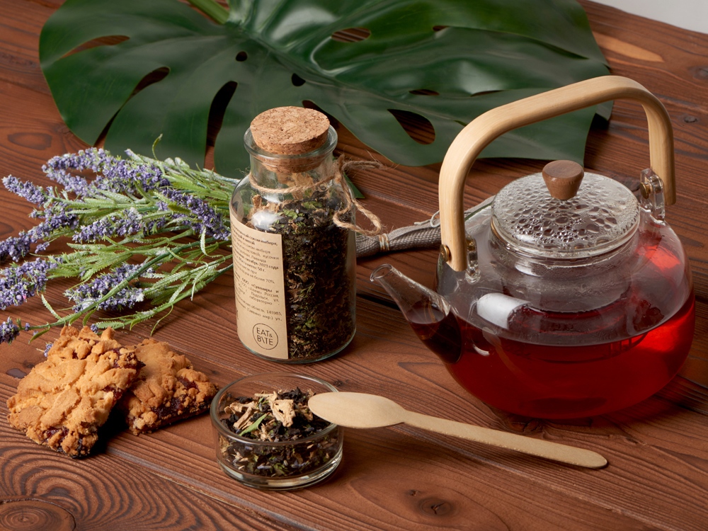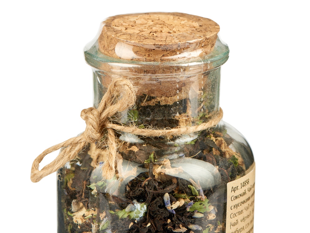 Чай с соком - натуральный, вкусный и полезный для здоровья напиток. Это не просто чай с фруктовыми кусочками и добавками, а чайные листья, наполненные соком свежайших плодов. Для изготовления 2 тонн такого чая используется 20 тонн свежих фруктов. По технологии чайные листья смешиваются с нарезанными кусочками фруктов и пропитываются выделяющимся соком. После этого вобравшие сок листья чая высушиваются и смешиваются с сублимированными ягодами или фруктами, образуя уникальный напиток. Состав: чай чёрный с имбирём и соком имбиря (чай чёрный байховый крупнолистовой, кусочки имбиря, сок имбиря), мята сушёная, Лаванда.