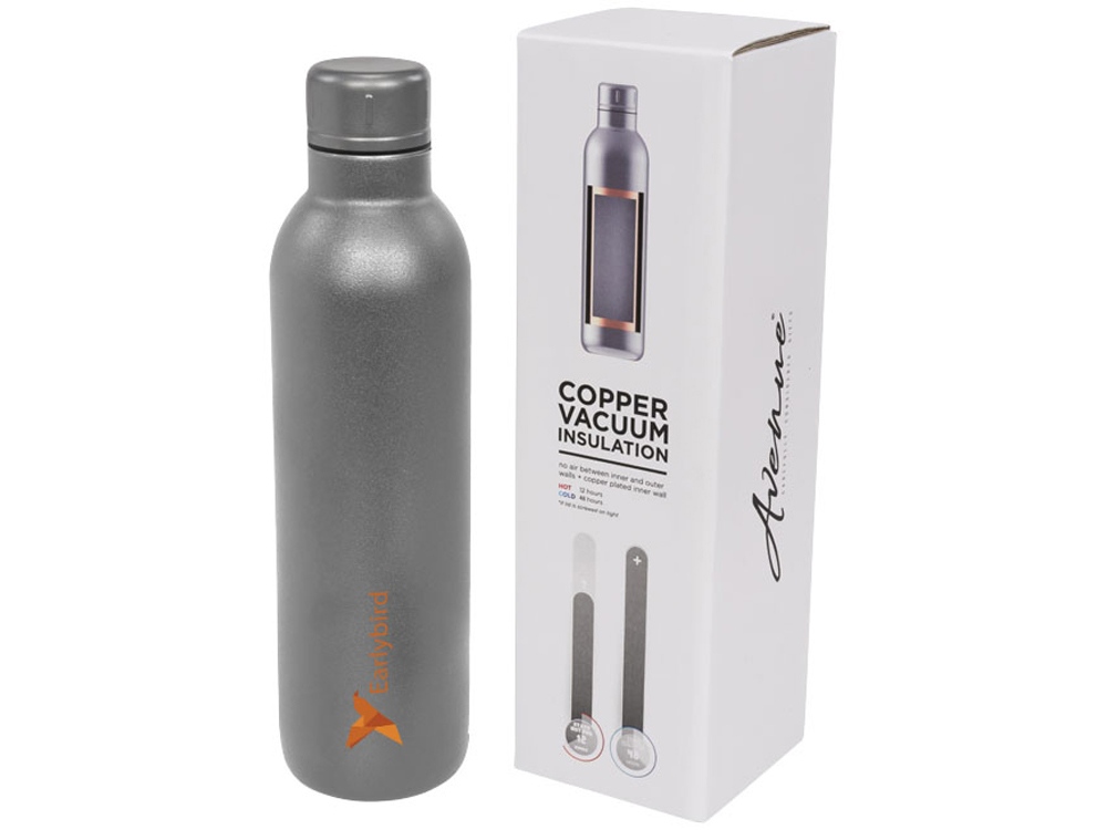 Спортивная бутылка Thor с вакуумной изоляцией объемом 510 мл. Прочная бутылка с двойными стенками из нержавеющей стали и вакуумной медной изоляцией сохраняет напитки холодными в течение 48 часов и горячими в течение не менее 12 часов. Конструкция бутылки предотвращает образование конденсата на внешней стороне. Модное, прочное порошковое покрытие. Герметичная завинчивающаяся крышка из нержавеющей стали. Объем – 510 мл. Предлагается в подарочной коробке Avenue. Нержавеющая сталь.