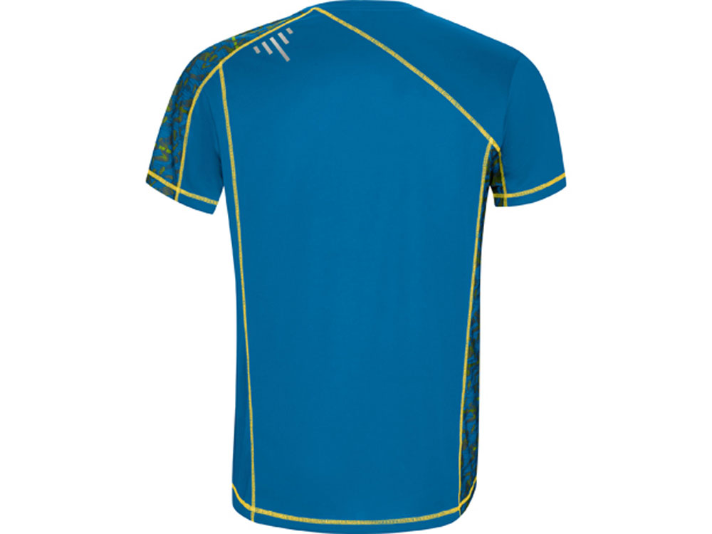 Спортивная футболка с коротким рукавом и принтованными вставками. Контрастные отстрочки плоским швом, светоотражающие элементы на полочке и спинке. Эко лейбл на рукаве. Технологичное полотно: *переработанный полиэстер с функцией контроля сухости *защита от UV излучения