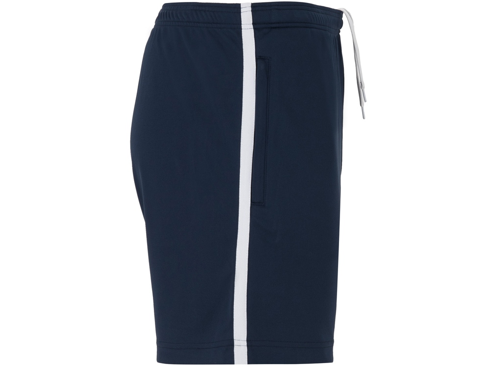 Спортивные шорты. Боковые карманы застегиваются на молнию. Эластичный пояс с контрастным регулируемым шнурком. Легкий и дышащий материал, подкладка из сетки. Контрастные лампасы в боковых швах.