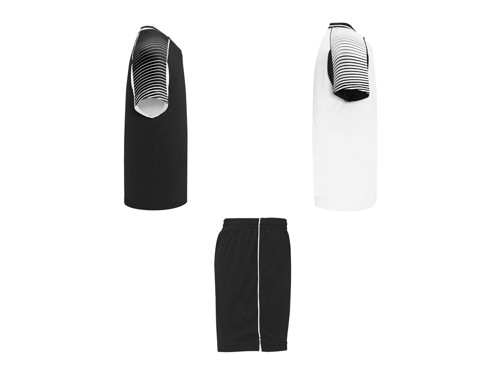 Спортивный костюм унисекс: две футболки и одни шорты. - Футболки с принтованными рукавами полуреглан. - Круглая горловина, из трикотажной ткани сзади. - Цвет второй футболки — полностью противоположный первой. - Шорты с эластичным поясом с внутренним шнурком в тон и усиленной строчкой. - Лампасы по бокам и боковые разрезы снизу штанин.