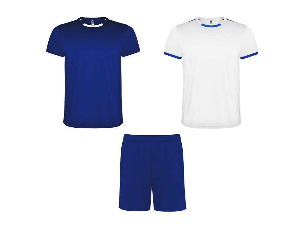 Спортивный костюм унисекс состоит из двух футболок и одних шорт. - Короткие рукава с контрастным широким рибом. - Цвет второй футболки — полностью противоположный первой. - Круглая горловина с двухцветной окантовкой и усиленными закрытыми внутренними швами. - Шорты с эластичным поясом с внутренним шнурком в тон и усиленной строчкой.