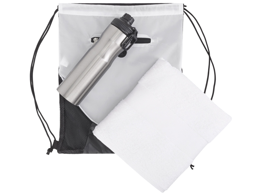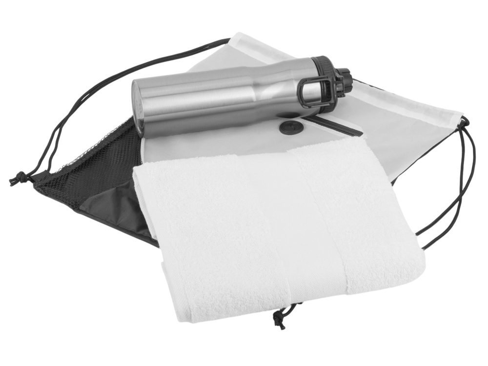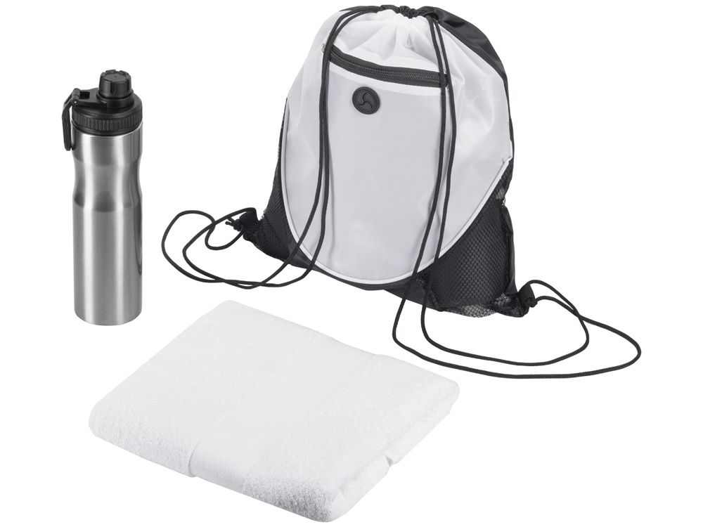 Надёжная и практичная бутылка изготовлена из пищевой стали марки SUS 304. Крышка оснащена складной ручкой, которая может быть использована для подвешивания или переноски, а также нетеряемым колпачком. Эргономичная форма позволяет бутылке удобно лежать в руке, а порошковое покрытие делает её тактильно приятной на ощупь. Вместительный рюкзак-мешок с дополнительным карманом на молнии пригодится, чтобы всегда держать под рукой всё необходимое для тренировки. Большое полотенце из 100% хлопка не вызовет аллергии и не навредит коже. • объём бутылки: 850 мл • вместительный рюкзак • практичный набор для спортивного мерча