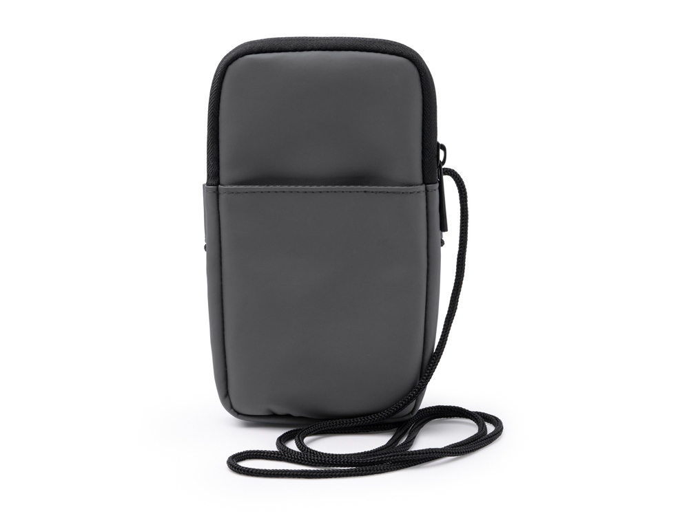 Сумка для мобильного телефона из искусственной кожи. Основное отделение закрывается на молнию. Внешний карман и регулируемый ремешок для переноски.