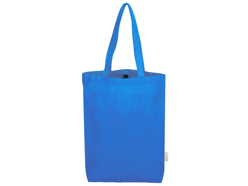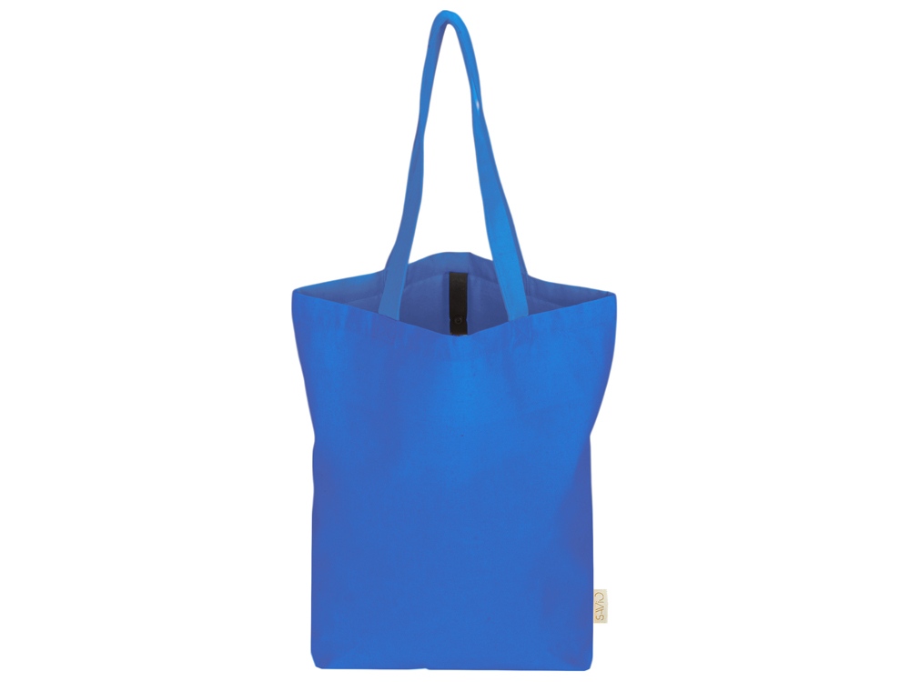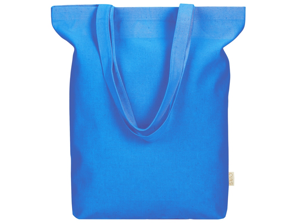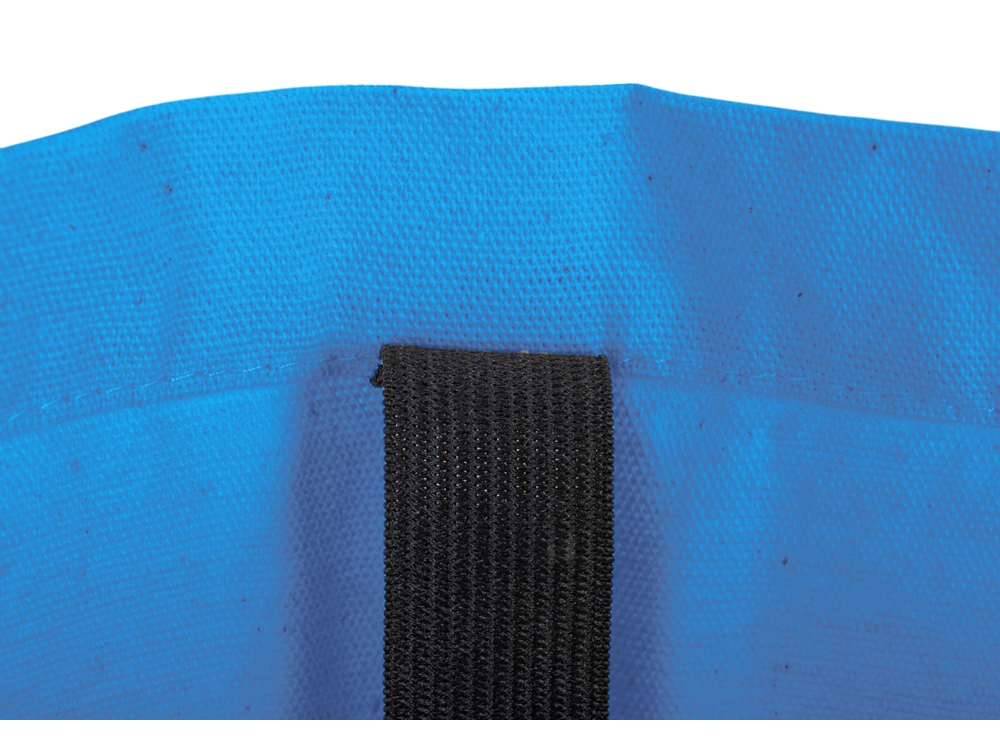 Удобная сумка-шоппер из переработанного хлопка. Можно хранить в сложенном виде и фиксировать с помощью эластичной ленты, застегивающейся на кнопку.