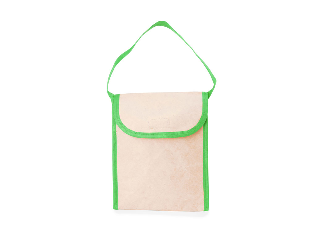 Сумка-холодильник из ламинированной бумаги с изотермической алюминиевой подкладкой и изоляционной пеной толщиной 2 мм. Ручка 60 см и клапан с застежкой-липучкой. Окантовка на сумке и ручке в тон