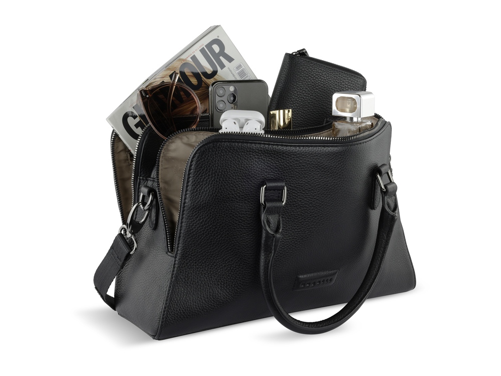 ЖЕНСКАЯ СУМКА ELSA Готовы к поездке в выходные? Мы раскрасим вашу ленту в Instagram невероятной коллекцией ELSA.Готовы к поездке в выходные? Мы раскрасим вашу ленту в соцсетях невероятной коллекцией ELSA. Коллекция ELSA предлагает широкий ассортимент аксессуаров и сумок разных форм и размеров, от элегантных кошельков и изящных наплечных сумочек для выхода в свет до вместительных шопперов и дорожных сумок для путешествий. Все модели серии изготовлены из высококачественной мягкой воловьей кожи и представлены в классическом черном, белом и бежевом цветах. Элегантное тиснение логотипа Bugatti придает очарование каждой модели. Коллекция выделяется продуманной функциональной организацией внутреннего пространства и защитой от радиочастотной идентификации RFID. Кошельки и ключницы оснащены специальным защитным слоем из фольги, который предотвращает незаконное сканирование вашей личной информации и препятствует списанию денежных средств с банковских карт. Какой бы аксессуар или сумку вы бы ни предпочли, будьте уверены, что с коллекцией ELSA вы точно окажетесь в центре внимания. СВОЙСТВА Функциональная организация: 3 отделения на молнии с карманом на молнии и 2 открытыми карманами, 2 ручки, съемный регулируемый плечевой ремень (до 130 см). Материал: воловья кожа/полиэстер Размер: 32 х 13 х 22 см Вес: 0,83 кг