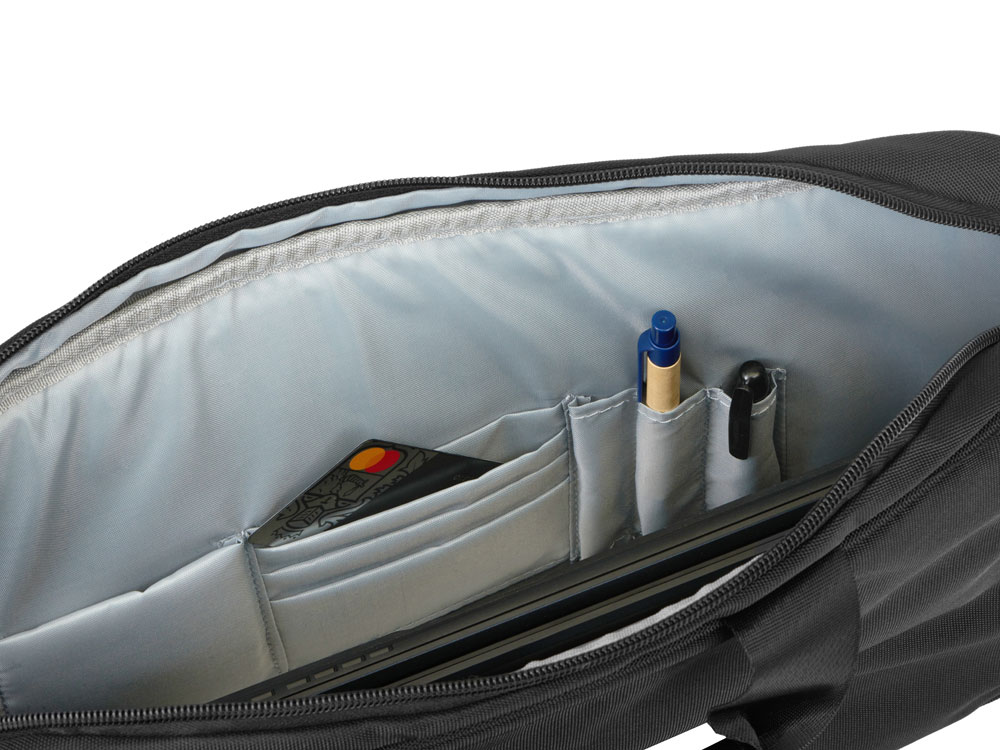 Бизнес-сумка для ноутбука в лаконичном дизайне с шильдом под нанесение вашего логотипа. - наружный карман на молнии - внутри органайзер для ручек, карт и телефона - съемный регулируемый ремень с металлическими карабинами - нетканый мешок для хранения в комплекте