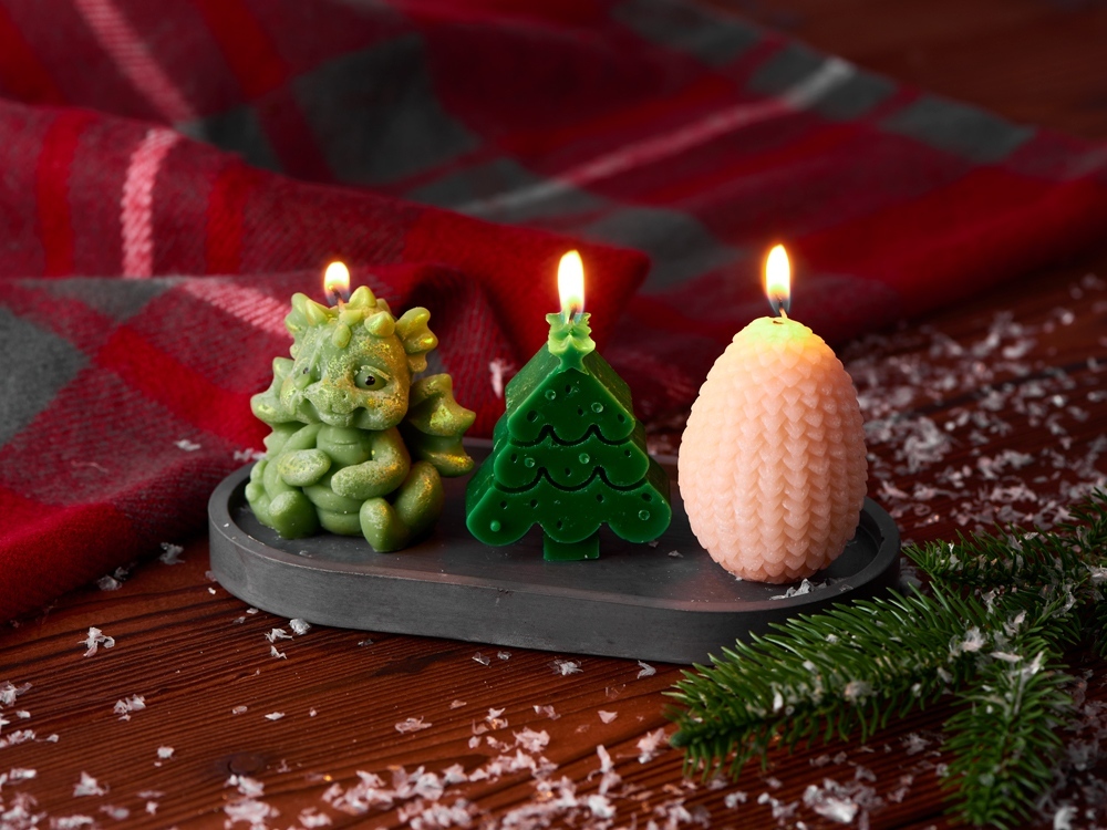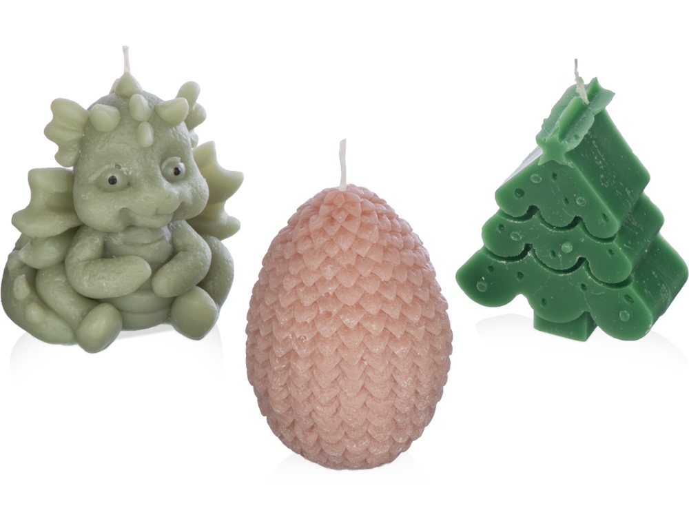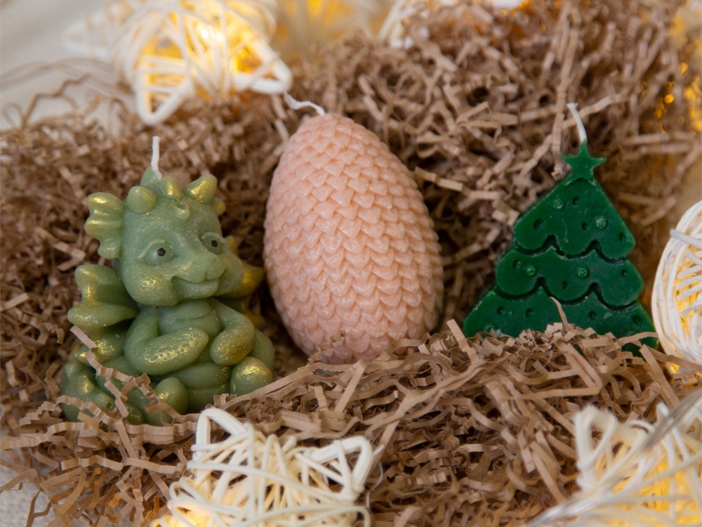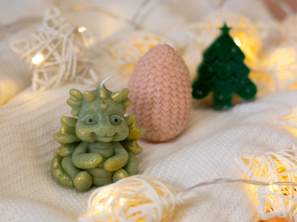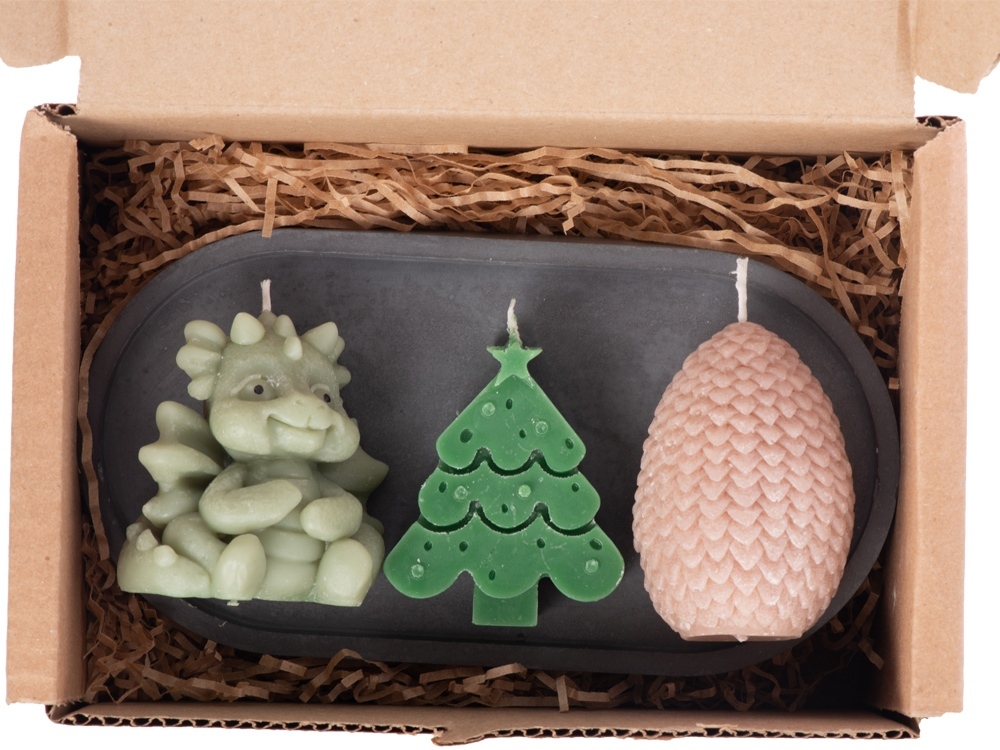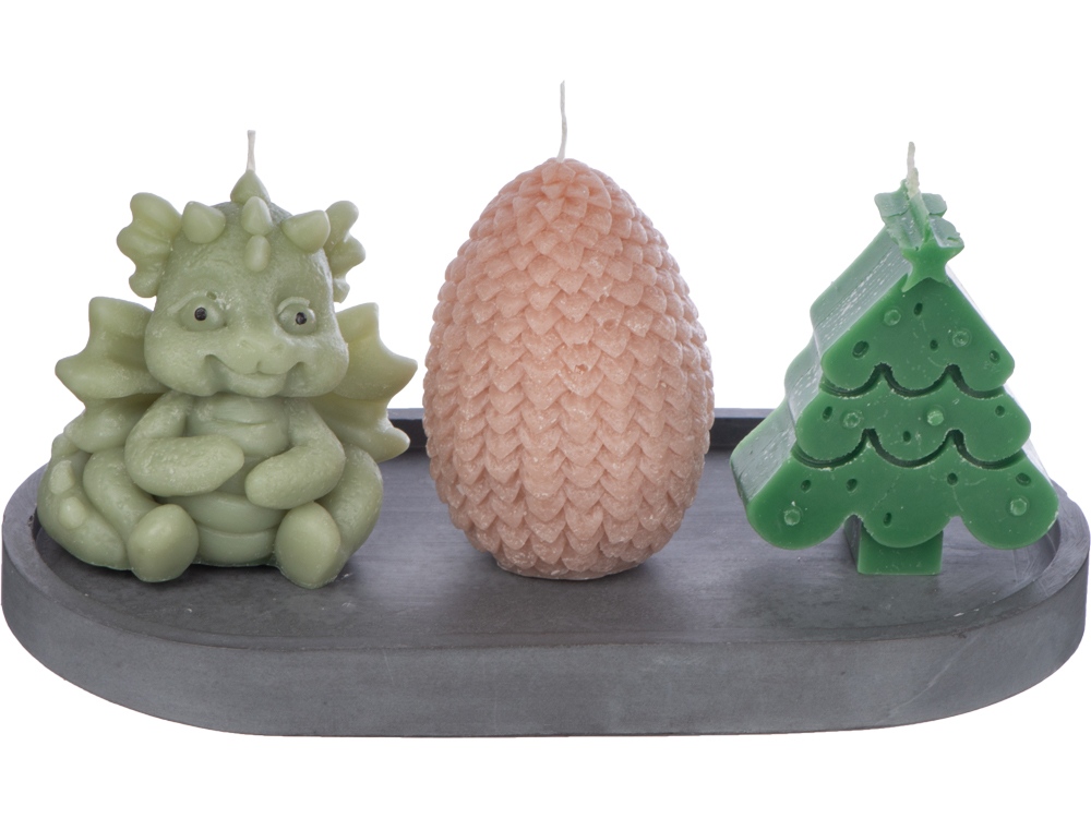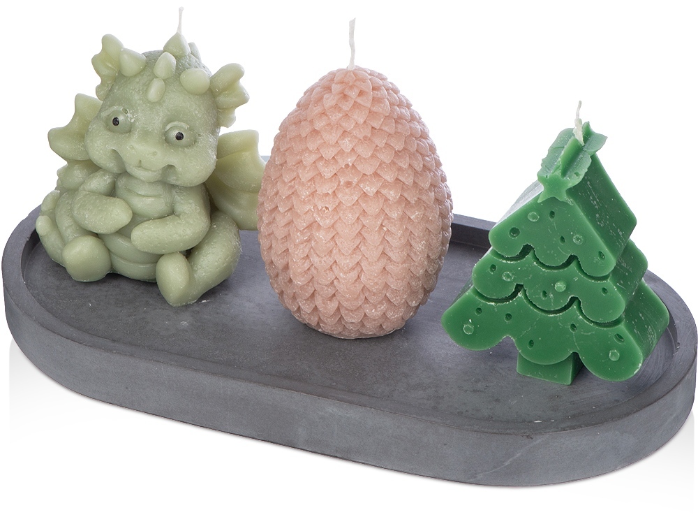 Этот набор свечей подарит вам новогоднее настроение и станет стильным украшением интерьера к любимому всеми с детства празднику. В набор входят три свечи на подставке — милый дракончик, яйцо и ёлка. Они подарят новогоднее настроение и ещё долго будут напоминать про год Дракона. После того, как прогорят все свечи, подставку можно использовать для организации на рабочем столе, как подставку для пало санто или других благовоний, или даже для хранения бижутерии. • Милый новогодний дизайн • Многофункциональная подставка из гипсобетона • Готовая идея новогоднего подарка • Символ 2024 года