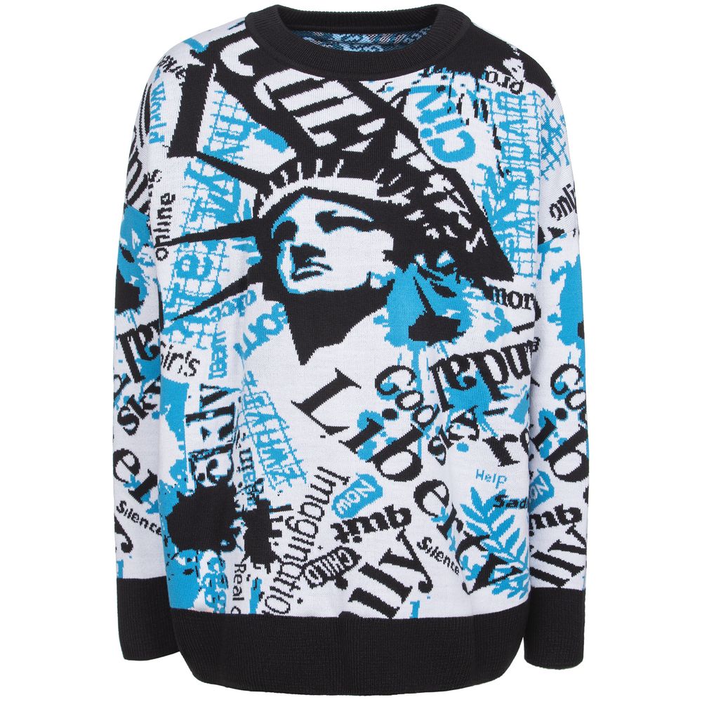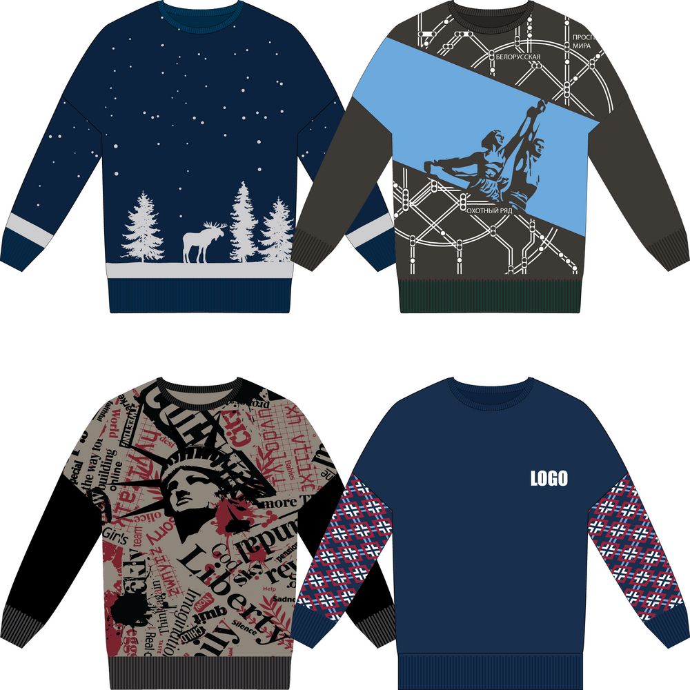 Свитер унисекс с вывязанным логотипом и индивидуальным рисунком в фирменной цветовой гамме.