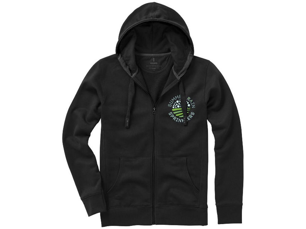 Свитер Arora с капюшоном и застежкой-молнией на всю длину. Стандартный покрой. Резинка 2х2 на боковых вставках, поясе и манжетах. Карман кенгуру. Мужская и женская модели с завязками на капюшоне. Подкладка внутри капюшона. Подкладка на полумесяце. Атласная лента внутри горловины. Принт лого сзади в тон изделия. Серебристые люверсы с лого. Трикотаж: 80% хлопок и 20% полиэстер, чесаная внутренняя сторона. 300 г/м².
