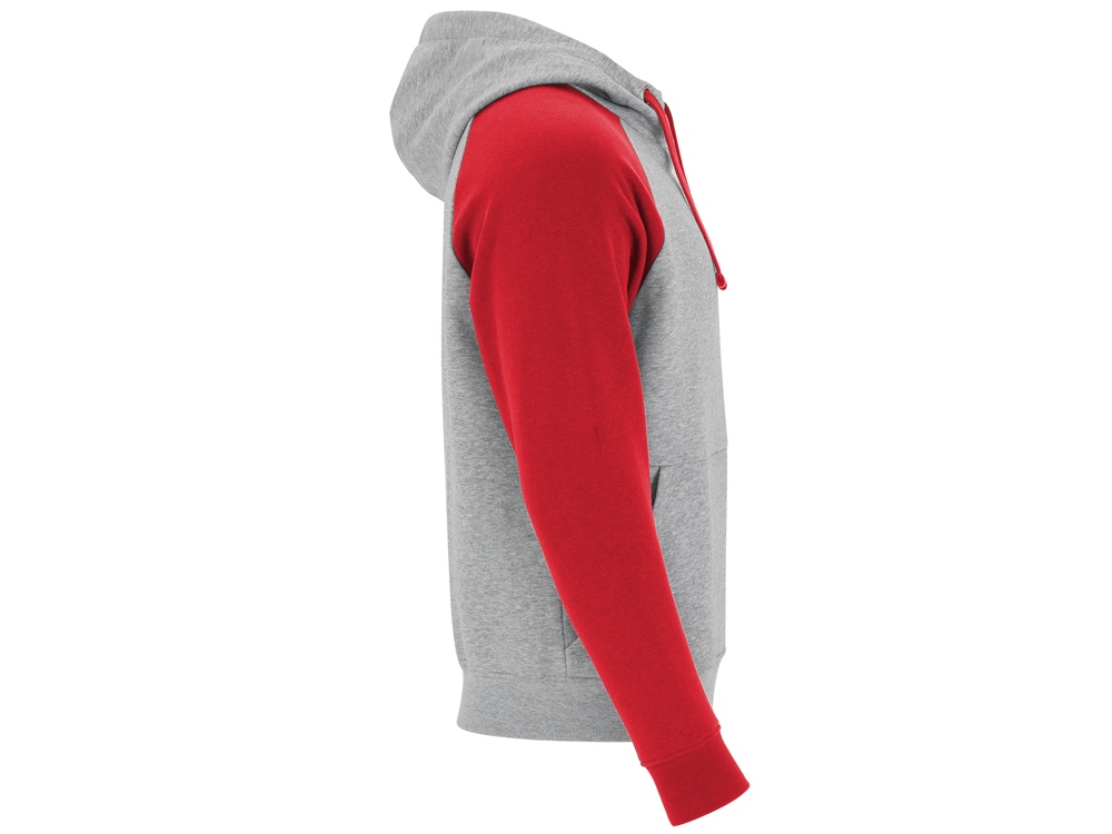 Худи с контрастным рукавом реглан. Капюшон с запахом, с контрастной подкладкой и шнурком. На полочке карман кенгуру. Манжеты рукавов и низ изделия из риба 1х1. В ассортименте представлена аналогичная детская модель Badet