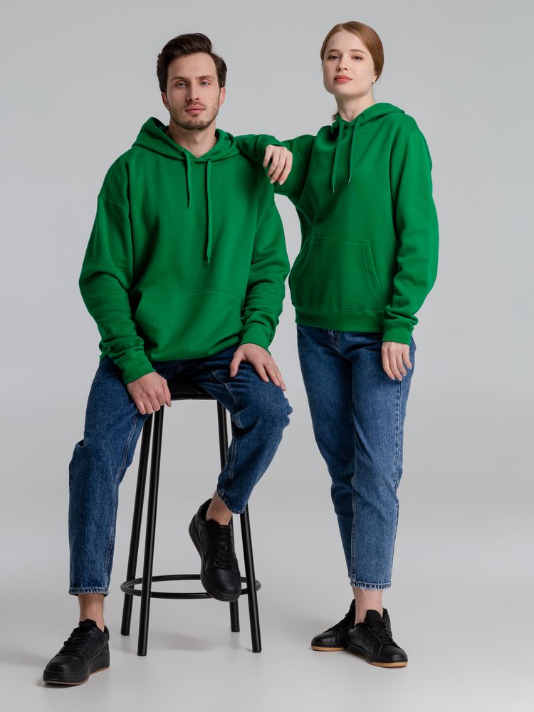 Классическая модель унисекс с карманом-«кенгуру». Внутренняя сторона из мольтона с начесом. Капюшон с металлическими люверсами и плетеной тесьмой тон в тон, укрепляющая тесьма по вороту сзади. Манжеты и низ изделия в резинку с эластаном.