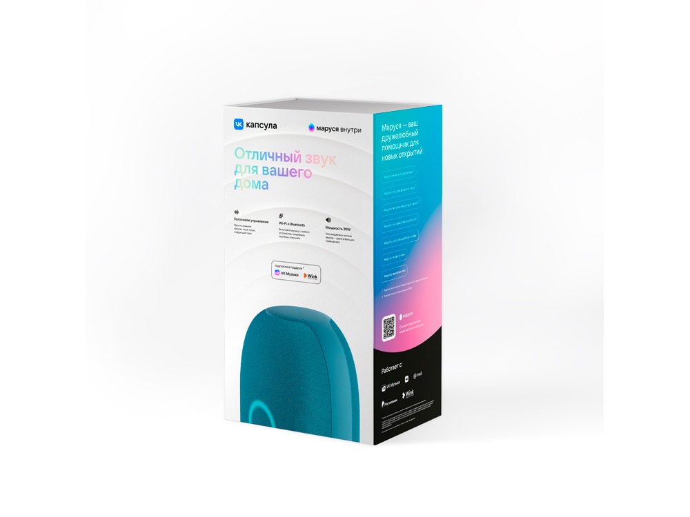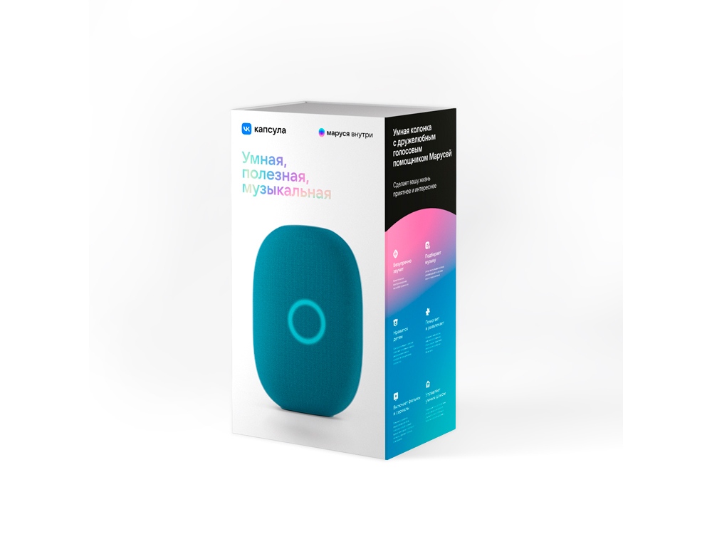VK Капсула — умная колонка с мощным звуком. Наслаждайтесь музыкой — Маруся подберёт вам трек по вкусу. А ещё помурчит, если погладить колонку. Дружелюбный голосовой помощник Маруся всегда рада поболтать с вами и ответить на вопросы. А ещё она расскажет о погоде и новостях, развлечёт играми и музыкой, подскажет рецепт, позвонит и напишет друзьям ВКонтакте — только скажите. Мощный звук У VK Капсулы два мощных динамика, громкие и глубокие басы — включайте музыку на максимум и наслаждайтесь чистым звуком без искажений и лишних шумов. Незаменима на большой вечеринке! Музыка на любой вкус Слушайте VK Музыку: Маруся поставит ваши любимые песни и найдёт подборки для спорта или релакса. Музыку из других сервисов можно включить по Bluetooth. А ещё есть приятные фоновые шумы и радио. Лучший друг детей Маруся обожает детей и отлично понимает их речь. У неё сотни развивающих игр и сказок, чтобы увлечь ребёнка, пока вы заняты. И есть детский режим, который защищает от взрослых тем и песен. Сердце умного дома Управляйте умной техникой голосом: запускайте пылесос, зажигайте свет, включайте кино в Wink. Маруся поддерживает более 40 брендов умного дома: Xiaomi, Aqara, Redmond, Hiper и другие. Голосовая персонализация Маруся может поздравить своего обладателя приветствием (разово или при каждой новой привязке к смартфону). Приветствие доступно для тиражей от 50 штук. Предложение по персонализации приветствия входит в цену. Срок установки голосовой персонализации до 5 дней после сборки заказа. Установка происходит удаленно (колонка скачает обновление при включении).