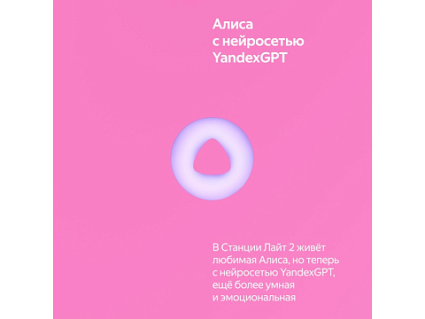 В Станции Лайт 2 живёт любимая Алиса, но теперь с нейросетью YandexGPT, ещё более умная, функциональная и эмоциональная. День за днём, детям и взрослым её компания никогда не наскучит. Благодаря технологии эмоционального синтеза Алиса в Станции Лайт 2 анализирует смысл диалога и в зависимости от контекста беседы меняет свои интонации — общение с ней становится по-настоящему живым и человечным. У Станции Лайт 2 появился LED-экран с анимацией, а это значит, что наконец-то можно посмотреть Алисе прямо в глазки. Или увидеть время и температуру. Динамик, спроектированный специально для Станции Лайт 2, поместили в новый корпус с увеличенным акустическим объёмом. Благодаря этому звучание стало мощнее, чище и насыщеннее, а басы — более выраженными. Технология узнавания голоса помогает Алисе в Станции Лайт 2 определять, кто из семьи к ней обращается, и подбирать для собеседника контент с учётом его музыкальных вкусов, интересов и возраста. Алиса понимает, когда с ней общаются дети и подростки, и включает им только безопасный контент. Вдохновляться, творить и хулиганить — на Станцию Лайт 2 можно наклеивать маски, превращая её в котика или межгалактического робота. А стикерами из набора здорово украшать и умную колонку, и всё вокруг. Станцию Лайт 2 можно переносить из комнаты в комнату и брать с собой, куда бы вы ни отправились, например, на дачу или в гости. Она будет сама подключаться к знакомым сетям Wi-Fi. Характеристики: 1 широкополосный динамик — 44,5 мм; Диапазон частот 120–16 000 Гц; Мощность 6 Вт; 2 микрофона; 802.11 b/g/n/ac (2,4 и 5 ГГц); Bluetooth® 5.0, BLE; Адаптер питания: 5 В, 2 А с разъёмом USB Type-C; Монохромный LED-дисплей, 36 сегментов; Сенсорная панель управления; Материал корпуса — пластик с многослойным Soft Touch покрытием.