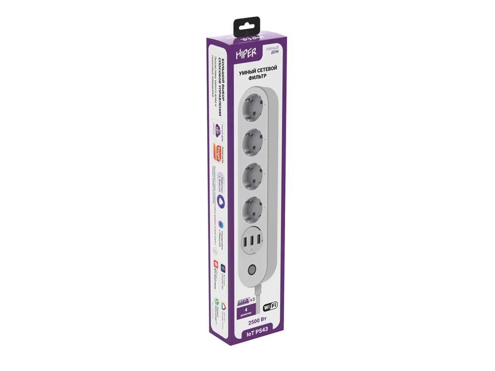 Сетевой фильтр с поддержкой технологии умный дом. Предназначен для защиты компьютерной, домашней и офисной электротехники от помех электросети, перегрузок и токов короткого замыкания. Благодаря технологии умный дом, фильтром можно управлять дистанционно. К ключевым особенностям устройства относятся: • Удаленный доступ к устройству. Управление устройством доступно через приложение HIPER IoT. • Поддержка голосовых помощников Алиса, Google, Салют, Siri, Марусю и другие. Управлять включением/выключением данного фильтра возможно, как при помощи умных колонок, так и через голосовые помощники на телефоне или планшете. • Большое количество интерфейсов. 4 евророзетки типа SCHUKO и 3 USB-порта, позволят подключить до 7 устройств одновременно. • Поддержка сценариев. Данный девайс может являться элементом общего сценария умного дома. • Возможность отдельного включения/выключения розеток, как по таймеру, так и удаленно. • Простота установки и настройки. Установить этот фильтр крайне просто, достаточно его воткнуть в действующую розетку и настроить в соответствии с инструкцией. • Защита от короткого замыкания. Автоматический предохранитель на 10А защитит как сам сетевой фильтр, так и устройства к нему подключенные. • Высококачественный негорючий пластик. Устройство долго сохранит свой внешний вид, даже при активном использовании. • Сохранение настроек при выключении электроэнергии. При включении-отключении от сети розетка восстанавливает последнее состояние — если она была выключена, то выключенной и останется.