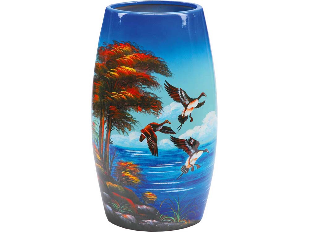 Отличная ваза поможет внести яркое пятно в интерьер любого помещения. Ваза Утиная охота с изображением диких уток выполнена из качественной керамики и раскрашена сочными цветами. Ваза станет превосходным подарком для заядлых охотников.