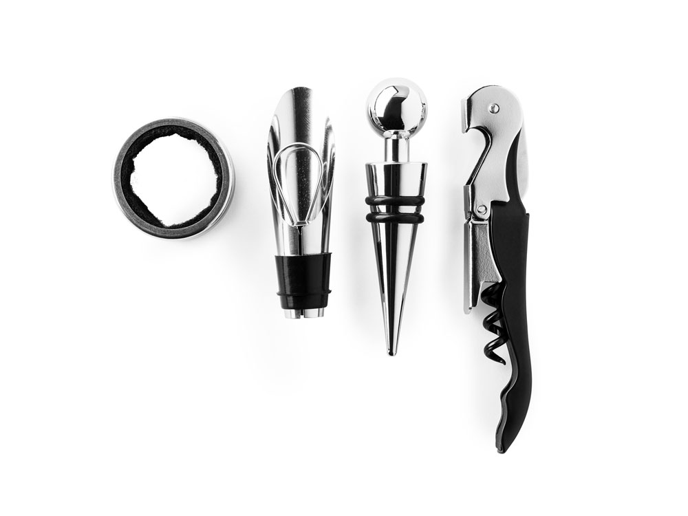 Винный набор с аксессуарами из нержавеющей стали, штопор, каплеуловитель, дозатор и пробка.