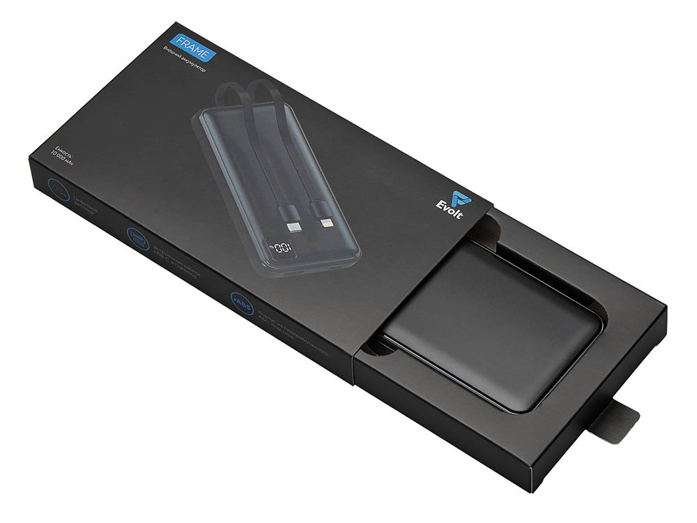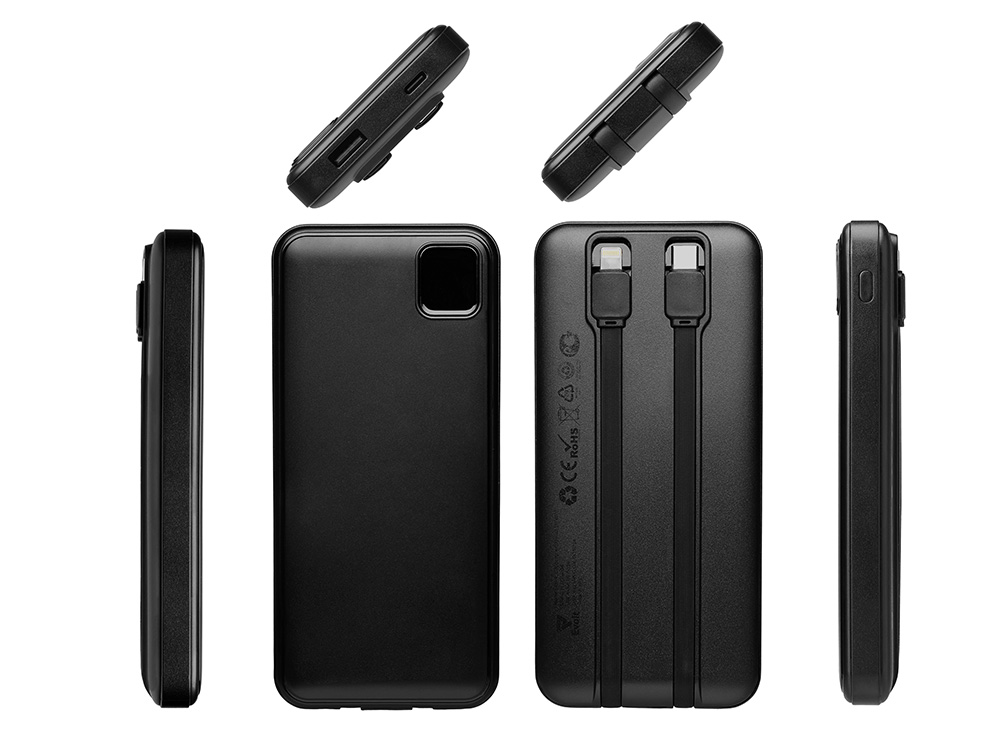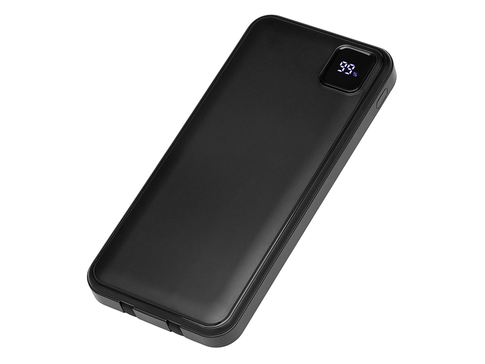 Удобный внешний аккумулятор с встроенными кабелями USB-C и Lightning — ваш надежный партнер в путешествиях, на встречах и в повседневных задачах. Цифровой дисплей в реальном времени показывает точный остаток заряда, а компактные габариты делают его таким же удобным, как смартфон. Прочный корпус из переработанного АБС-пластика и емкость 10000 мАч обеспечивают долгую работу даже при интенсивном использовании. Идеальный выбор для тех, кто ценит комфорт и функциональность в одном устройстве. Продуманная упаковка: для открытия просто потяните за язычок, и появится гаджет с нанесением. - Встроенные кабели USB-C и Lightning — больше не нужно искать провода - Цифровой дисплей с точным отображением заряда - Удобная зона под нанесение логотипа - Компактный размер, сопоставимый с телефоном — легко помещается в карман, сумку или портфель. - Упаковка с удобным и быстрым открытием