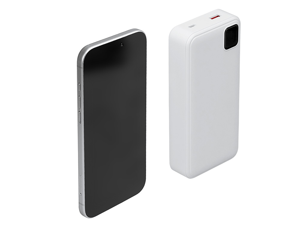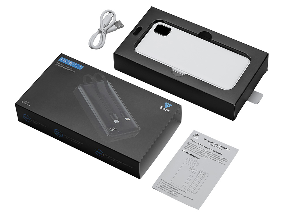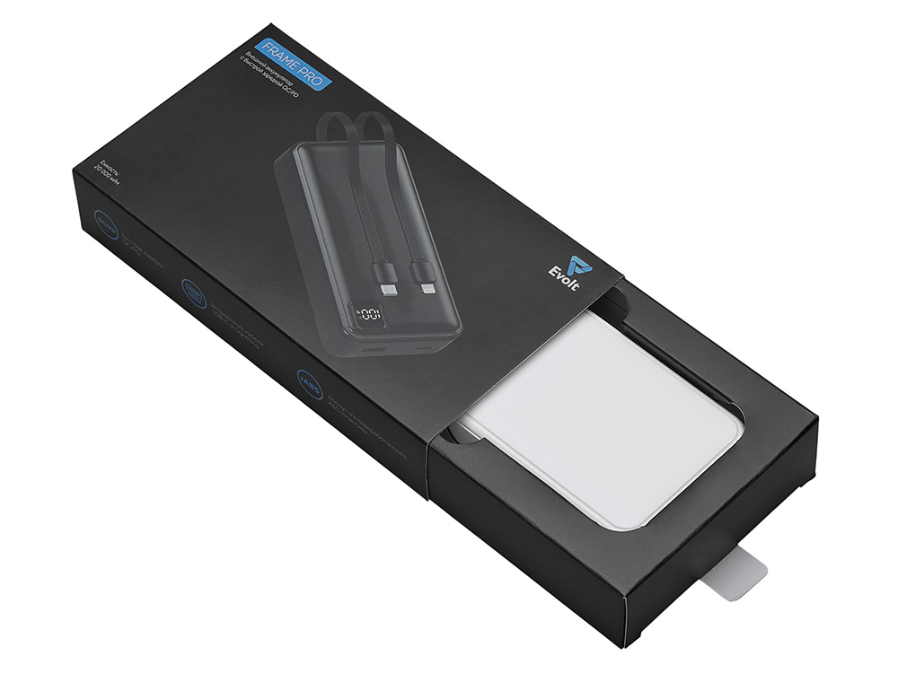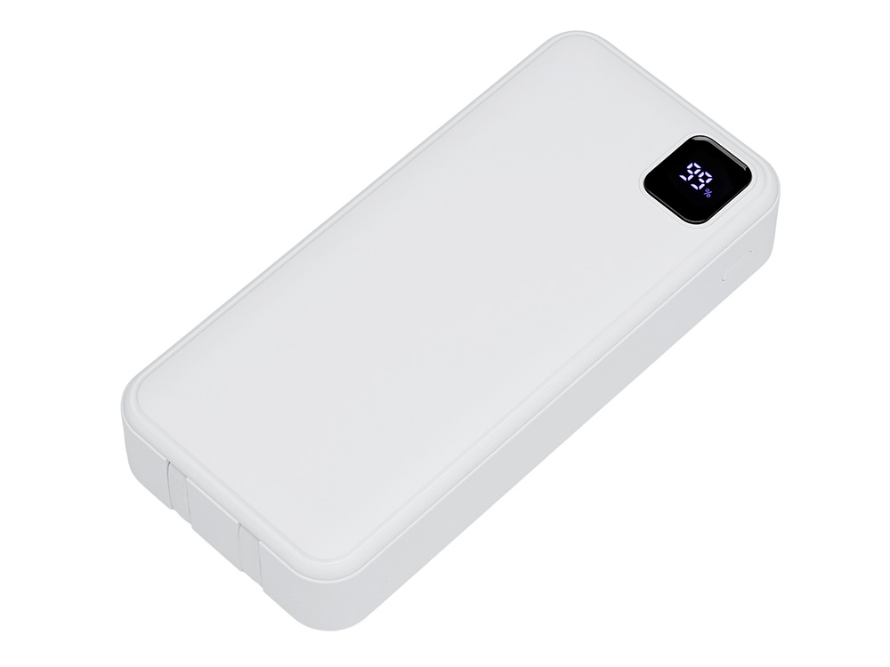 Удобный внешний аккумулятор с функцией быстрой зарядки и встроенными кабелями USB-C (симметричный разъём USB тип С) и Lightning (разъём в ранних версиях iPhone) — ваш надежный партнер в путешествиях, на встречах и в повседневных задачах. Цифровой дисплей в реальном времени показывает точный остаток заряда и статус быстрой зарядки, а встроенные кабели и несколько разъемов позволяют заряжать до 4 устройств. Прочный корпус из переработанного АБС-пластика и емкость 20000 мАч обеспечивают зарядом все ваши устройства на долгий срок. Идеальный выбор для тех, кто ценит комфорт и функциональность в одном устройстве. Продуманная упаковка: для открытия просто потяните за язычок, и появится гаджет с нанесением. - Встроенные кабели USB-C и Lightning — больше не нужно искать провода - Цифровой дисплей с точным отображением заряда - Удобная зона под нанесение логотипа - Функция быстрой зарядки, заряжает на 50% быстрее - Упаковка с удобным и быстрым открытием - До 4-5 полных зарядок смартфона