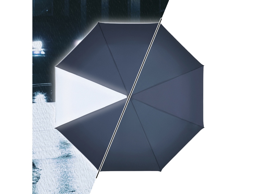У этого зонта на двух диагональных клиньях и на отделке чехла имеется светоотражающее нанесение. Это обеспечивает дополнительную защиту в темное время суток. Мягкая пластиковая ручка с удобной кнопкой открытия и защита от порывов ветра делают зонт незаменимым аксессуаром.